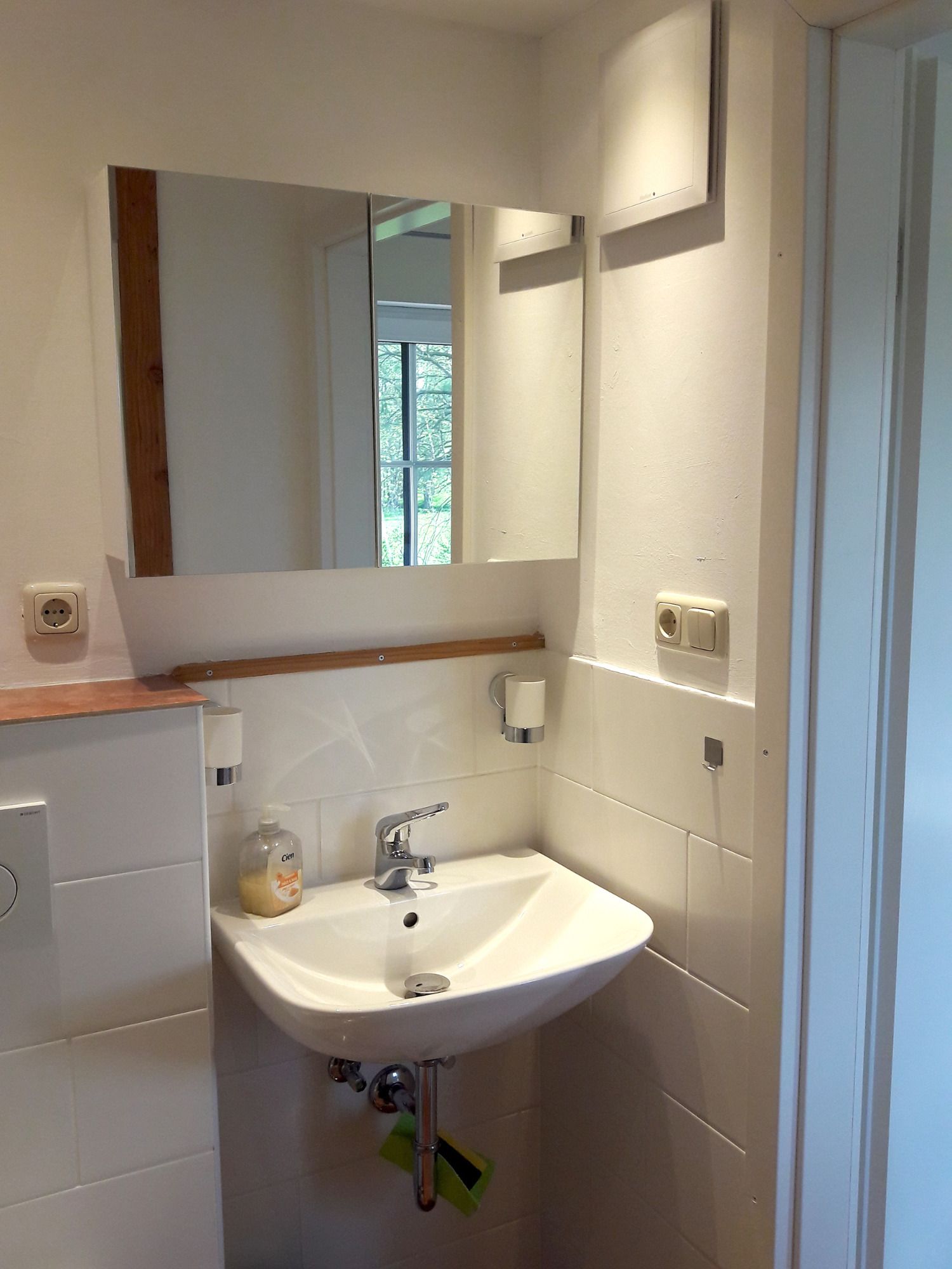 Angrenzend befindet sich der abgetrennte Sanitärbereich mit Dusche/ WC und Waschbecken.
